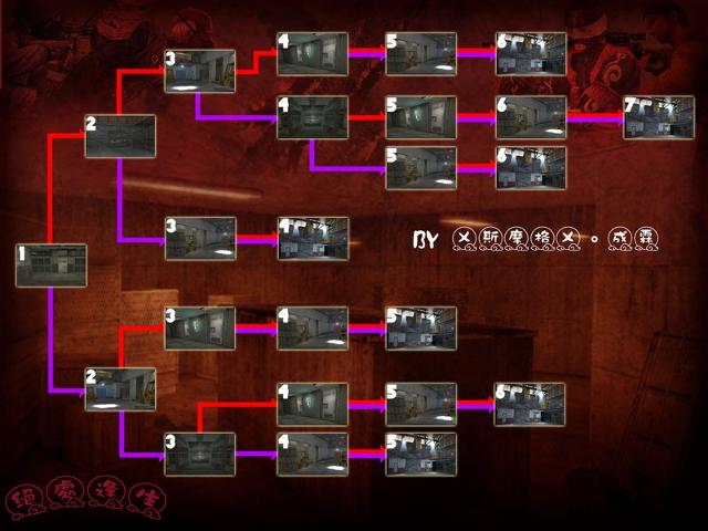 Choas: After you play until halfway, you got two route. You can choose either one at the end of the second round. One route will take you through more room than the other before the boss. The more room you go, the harder the zombies will be but the boss battle will be the same. There is one room for camping and up your level and there is a door for backup. Press the button to close the door and to stop zombies from coming out. Quickly kill as much zombies as you can before the door reopens. Another one is also a camping room where zombies will come out from everywhere, one of the hardest room to play. Another type of room you need to rush through the whole map, pressing buttons, waiting for doors to open and breaking down a door at the end. Another type is the opposite of the previous one, breaking down a door at the start and then rush through the whole map. Watch out Daemon for he will take your guns and leave you vulnerable. Here is a diagram on all the routes.