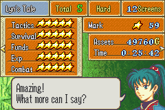 This is a ranked TAS of Fire Emblem 7 in Lyn's Hard Mode, completing each chapter in the lowest number of turns that still allows for all rank targets to be achieved. In essence, 59 out of the 60 tactician stars are earned - for some reason, the Funds target for 7x is unachievable in Hard Mode, but it is possible in Normal Mode.
