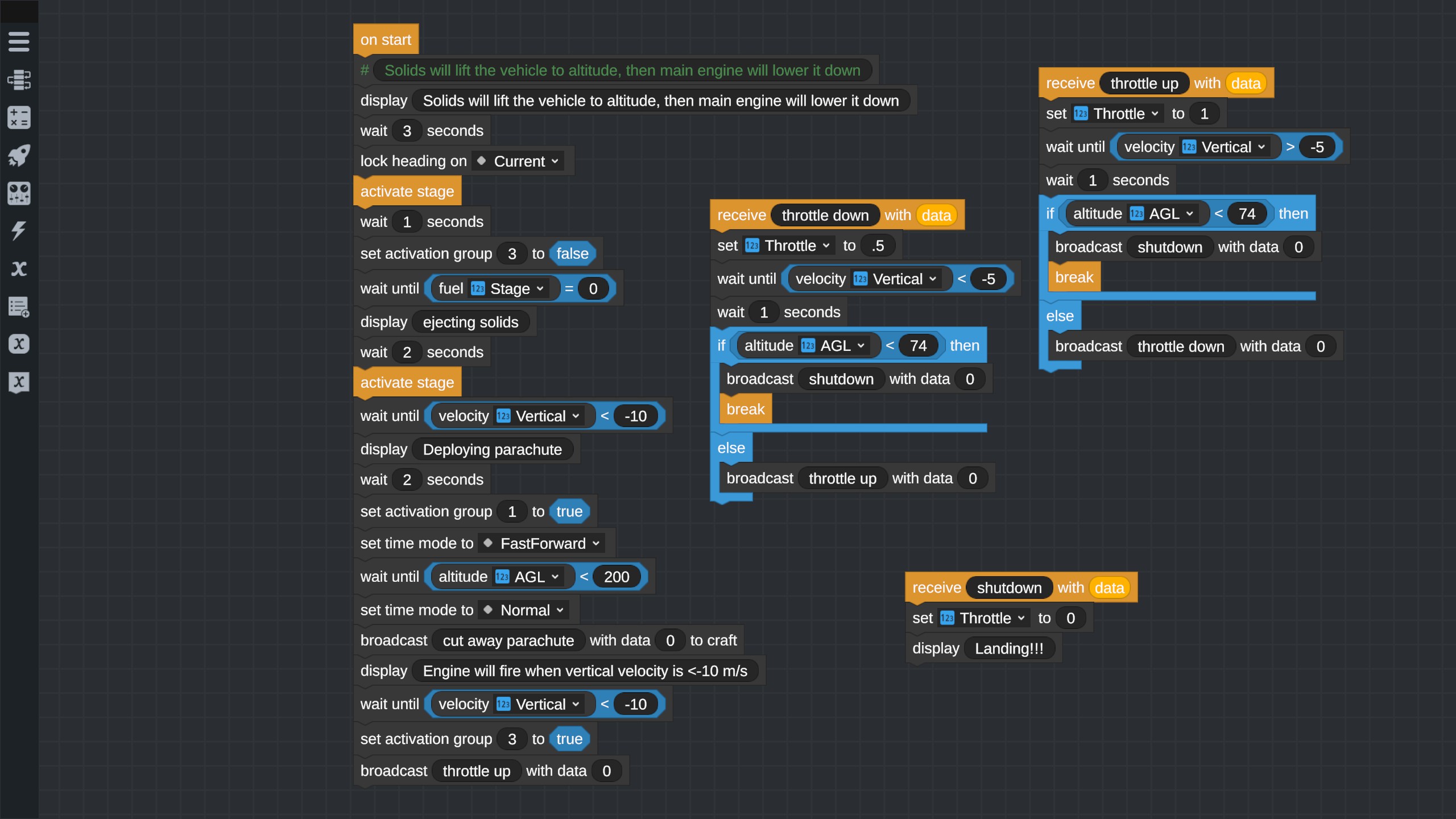 I have been playing around with the Vizzy Visual Programming System in the game and decided to build a test rocket that would lift off from the pad, then float down part way under a parachute then complete the decent with a throttling engine, actually more of a bang-bang approach. All steps are accomplished with the programing system.