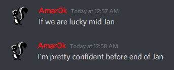 Someone asked if it is still likely the update will come this month, to which Amarok this time stated he is uncertain but hopes so. This is quite a stark contrast to when he was last asked prior to vacation and said mid January was possible if lucky, but he was confident before the end of January ( https://i.gyazo.com/33e62072bb6b689603b2cfcc87c68ec9.png ).